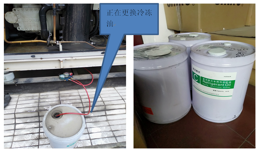 本次保养含更换压缩机冷冻油、机油过滤器、干燥剂、相序保护器,紧固除尘并检测电气元件性能,检查保护装置、压缩机、膨胀阀、循环水管道等共计16项工作。